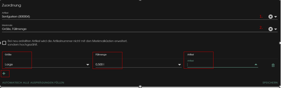 Hier kann man einen bestimmten Artikel suchen, und ihm entsprechende Merkmale zuweisen. Durch die Auswahl der verschiedenen Merkmallisten, kann man im weiteren Schritt dem Artikel die Besonderheiten zuordnen. So können die neuen Unterartikel des Hauptartikels gebildet werden.