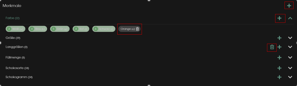 Unter Merkmale sieht man alle angelegten Merkmale aus der SelectLine. Hier können Änderungen an den Merkmalausprägungen vorgenommen werden, wie löschen oder hinzufügen. Ebenso können neue Merkmale angelegt werden oder gelöscht werden.