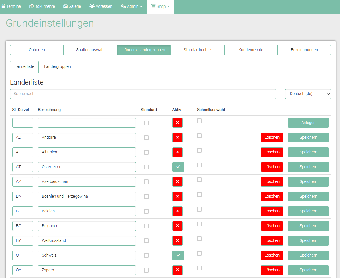 Über die Länderliste können Sie festlegen, welche Länder im Shop "aktiv" sein sollen und welches Land "Standard-Land" ist. Die ist je Sprache möglich/ erforderlich.
