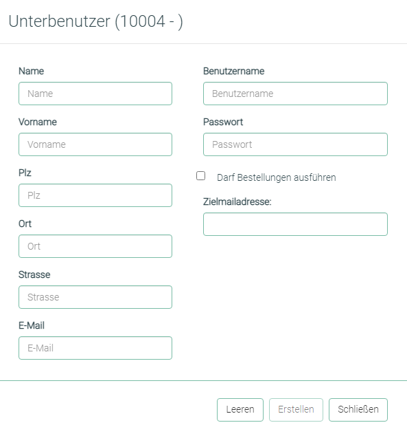 Um den Unterbenutzer anzulegen, müssen diese Felder ausgefüllt werden. Wenn der Haken bei "Darf Bestellungen ausführen" gesetzt wird, so kommt eine weitere Auswahl, in der man auswählen kann, ob die Bestellmail an den Kunden oder an den Benutzer versendet wird. Wird der Haken bei "Darf Bestellungen ausführen" nicht gesetzt, so kann der Benutzer nur den Warenkorb füllen aber nicht absenden.