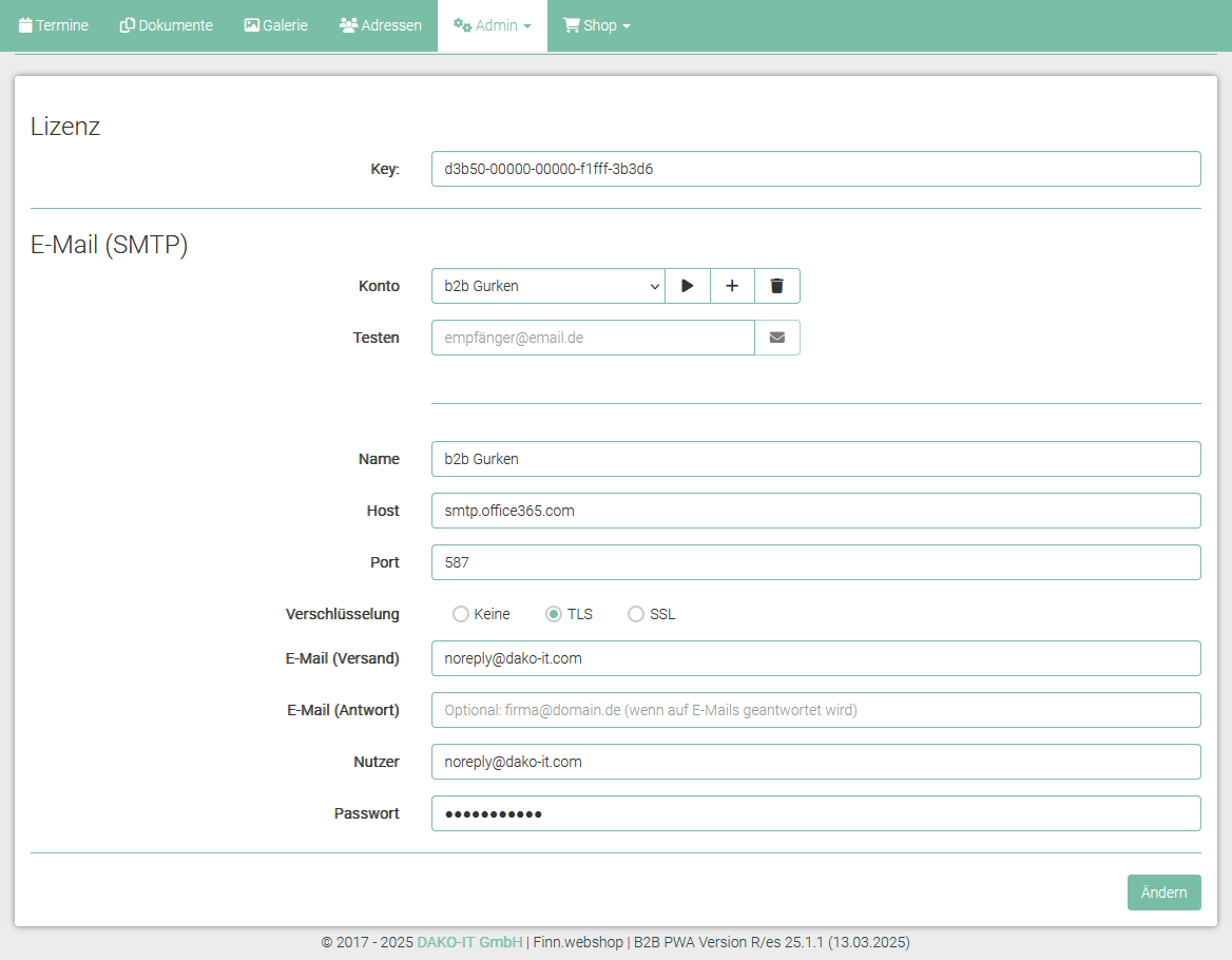 Hier wird die Lizenz eingetragen und die Daten für den Mailversand aus dem Shop gepflegt.