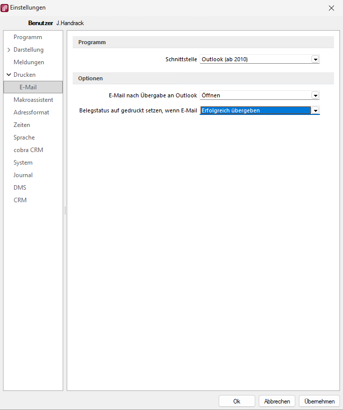 Zusätzlich können Sie, unter Verwendung der Schnittstelle Outlook COM-Verbindung konfigurieren, dass der Belegstatus auf gedruckt gesetzt wird wenn: