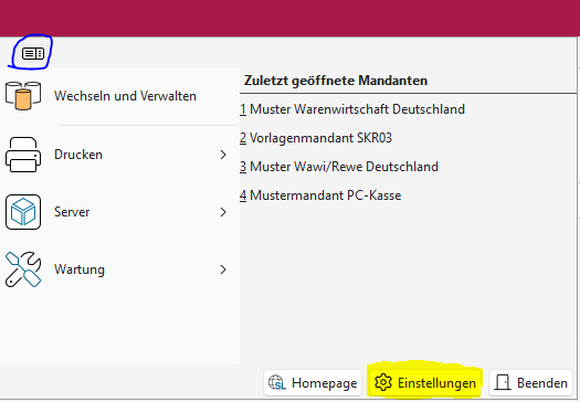 Um die verwendete Programmschnittstelle für den E-Mail Versand zu ändern, öffnen Sie über das Applikationsmenü der SelectLine die Einstellungen.