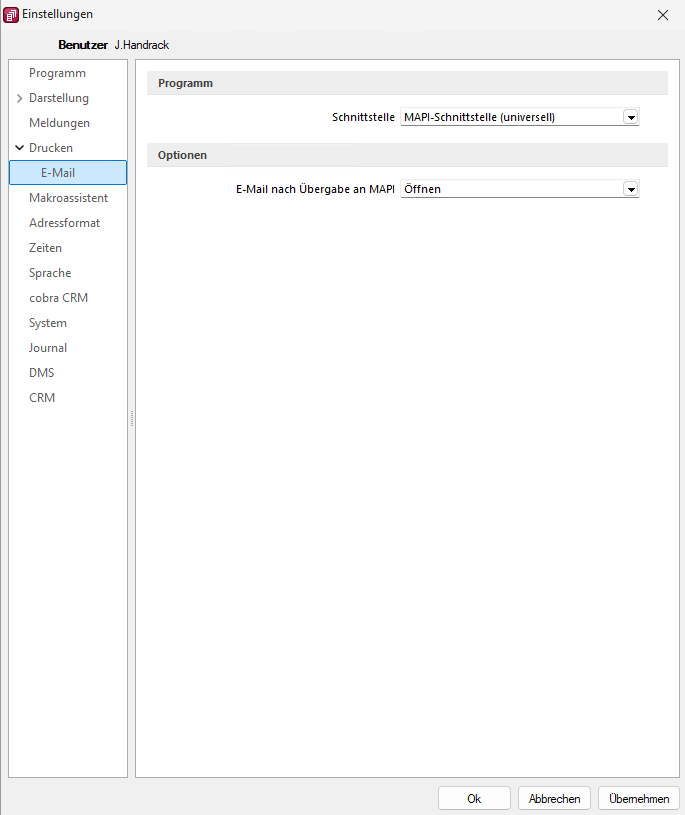 Im Abschnitt Programm können Sie die für das Versenden von E-Mails zu verwendende Schittstelle auswählen.